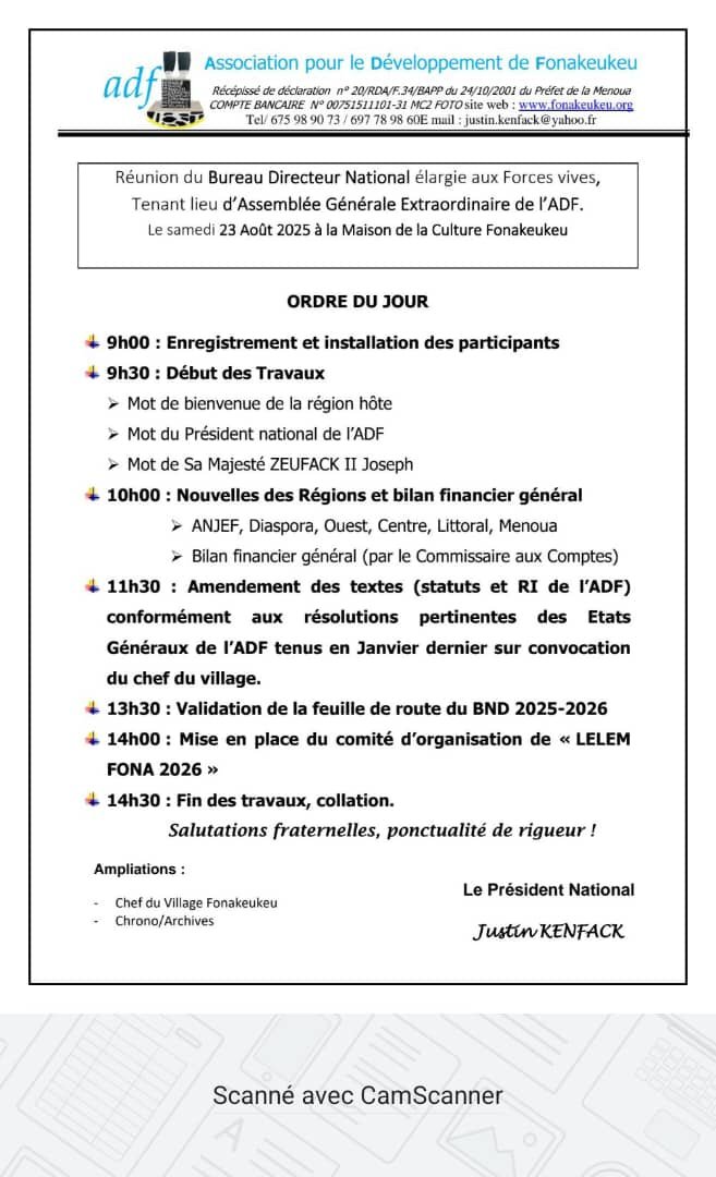 Le Bureau Directeur National de l’ADF informe la communauté Fonakeukeu du pays et de la Diaspora, ainsi que ses nombreux amis et sympathisants, que la réunion semestrielle élargie aux forces vives et aux délégués d’associations se tiendra :